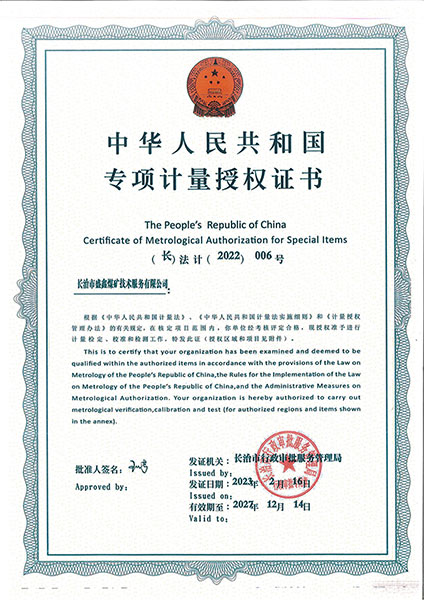 • 專項(xiàng)計(jì)量授權(quán)證書(shū)